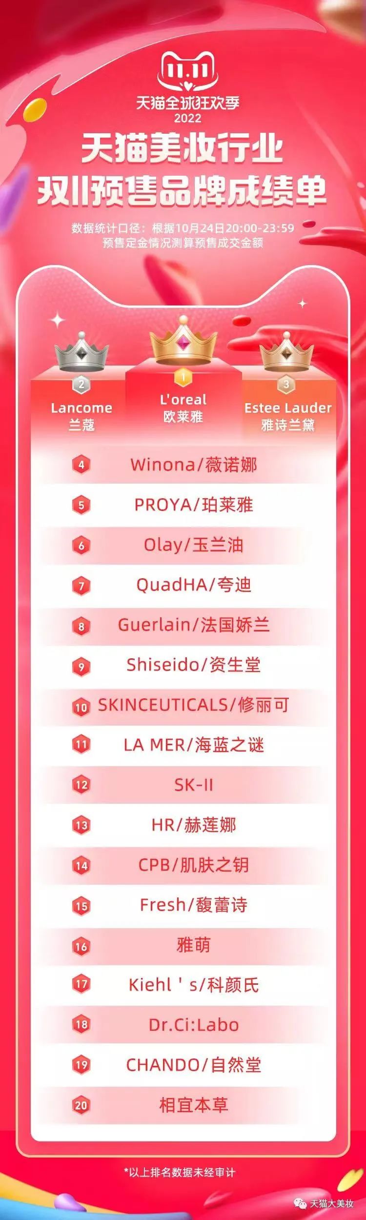从具体榜单来看,“双11预售品牌成绩单”分别为兰蔻、欧莱雅、雅诗兰黛、薇诺娜、珀莱雅、OLAY玉兰油、夸迪、法国娇兰、资生堂和修丽可。