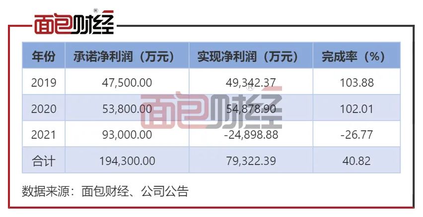 重组借壳上市期间,公司承诺2019年至2021年实现扣非净利润将分别不低于4.75亿元、6.68亿元、8亿元。前两年公司均完成业绩承诺,但2021年公司扣非净利润锐减并由盈转亏,面临业绩补偿。
