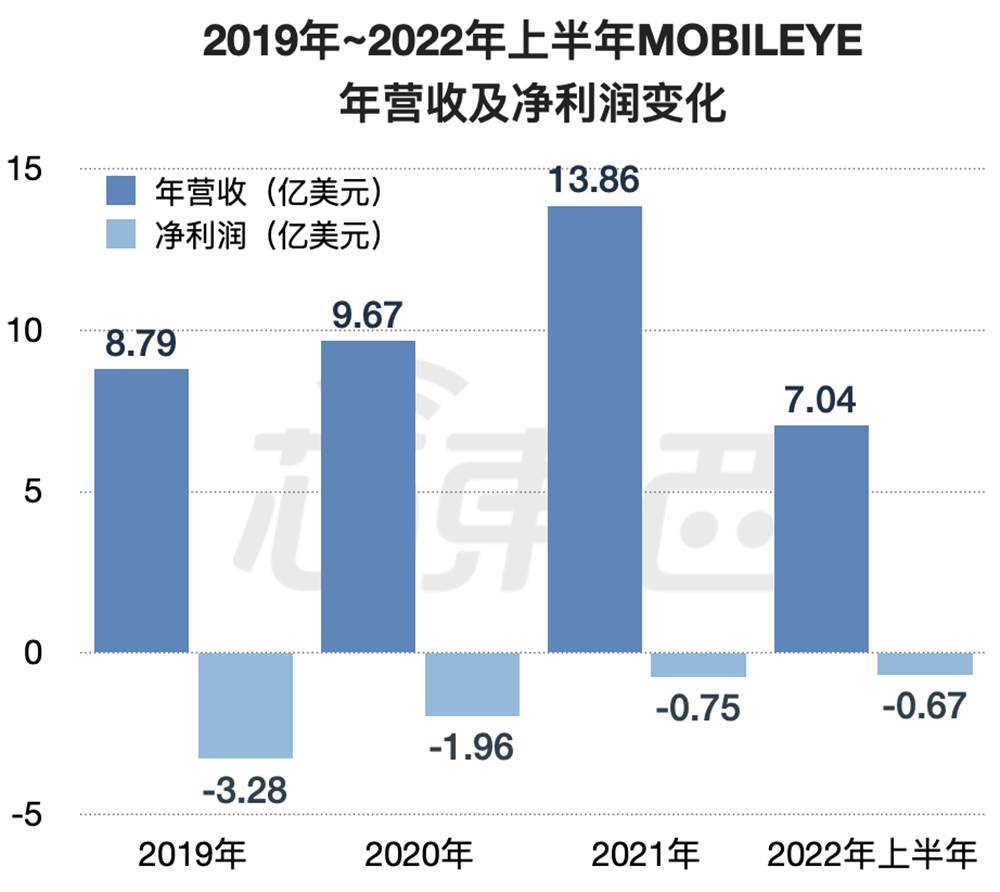 2019年~2022年上半年,Mobileye营收及净利润变化