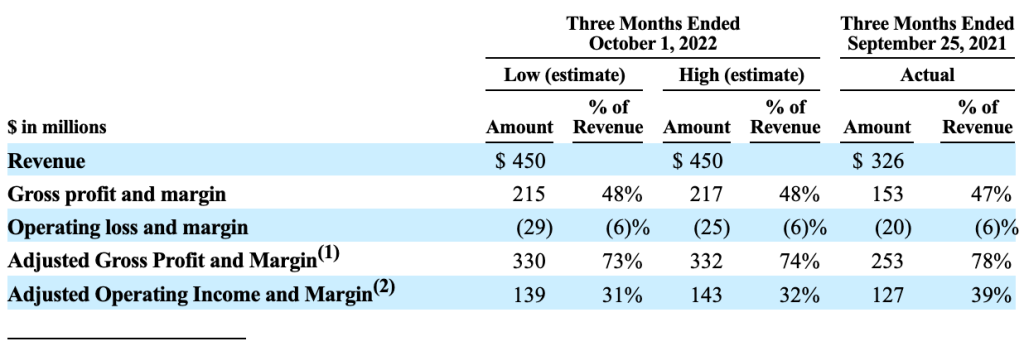 与截至2021年9月25日的3个月相比,截至今年10月1日的3个月间,其毛利润从6200万美元增至6400万美元,毛利率从47%增加到48%;调整后营业收入将从1200万美元增至1600万美元,调整后毛利率将从78%下降至73%~74%。