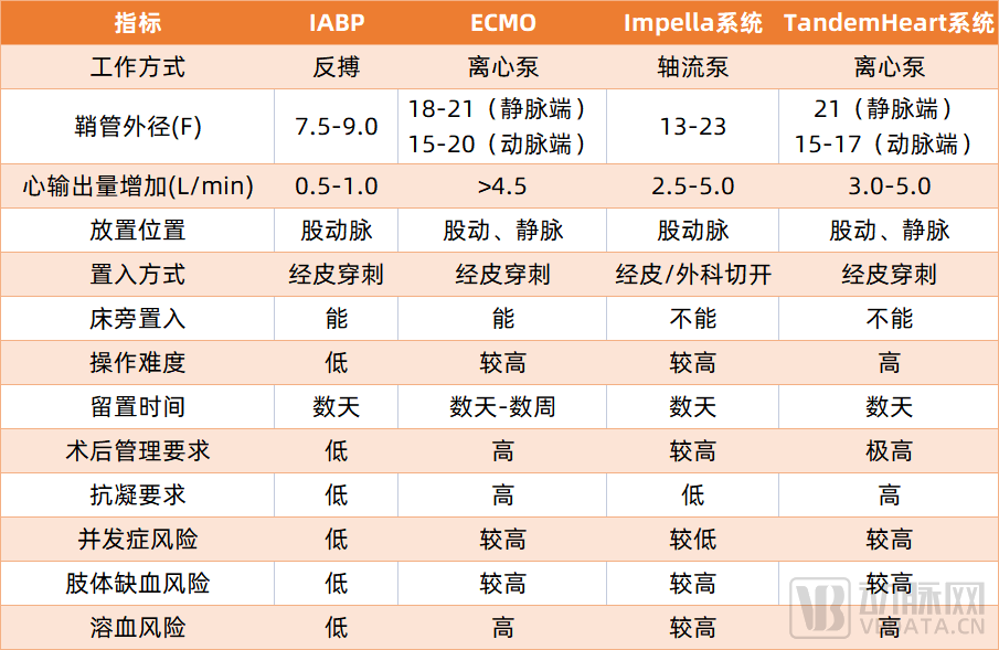 总的来看,IABP的操作难度及风险低,但每分钟增加的流量较少;ECMO提供每分钟超4.5升的流量支持,且其在患者体内的留置时间为数天或数周;Impella产品可提供每分钟2.5-5升的流量,留置时间为数天,且术后管理要求、抗凝要求、并发症风险均更低;TandemHeart系统可提供3-5升流量,但术后管理要求、抗凝要求、并发症风险等均更高。(Impella ECP系统由于缺乏相关数据,未作讨论。)