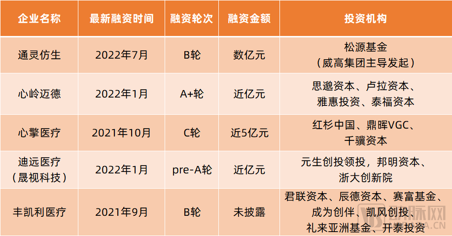 庞大的市场,不仅吸引了通灵仿生、心岭迈德、心擎医疗、迪远医疗(晟视科技)、丰凯利医疗、心恒睿医疗等多家创新企业布局,还吸引了红杉中国、君联资本、鼎晖VGC、千冀资本、雅惠投资、泰福资本、元生创投、辰德资本、礼来亚洲基金等知名投资机构押注。