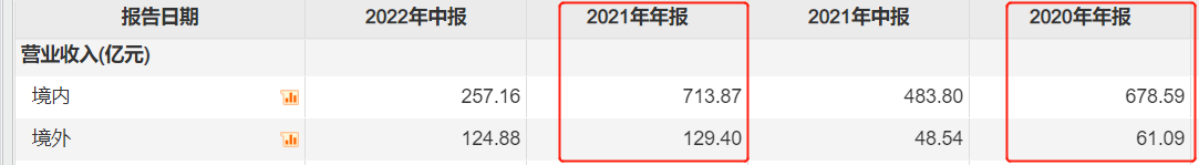 反观境内贡献锐降。2022年上半年贡献度加速下滑,境外营收由去年同期不足484亿元降至257亿元,降幅近46%。2021年同比降幅仅超5%。