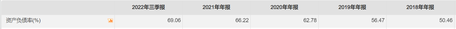 在公司业务大扩张的同时,公司的负债率在攀升,由2018年的50.46%涨至2022年三季末的69.06%,目前负债合计达1195.8亿元,其一大原因则是应付票据及应付账款的激增,由2018年的近180亿元攀升至2022年三季末的604亿元。如今,仅这两项就占总负债的50%,占总资产的34.9%。