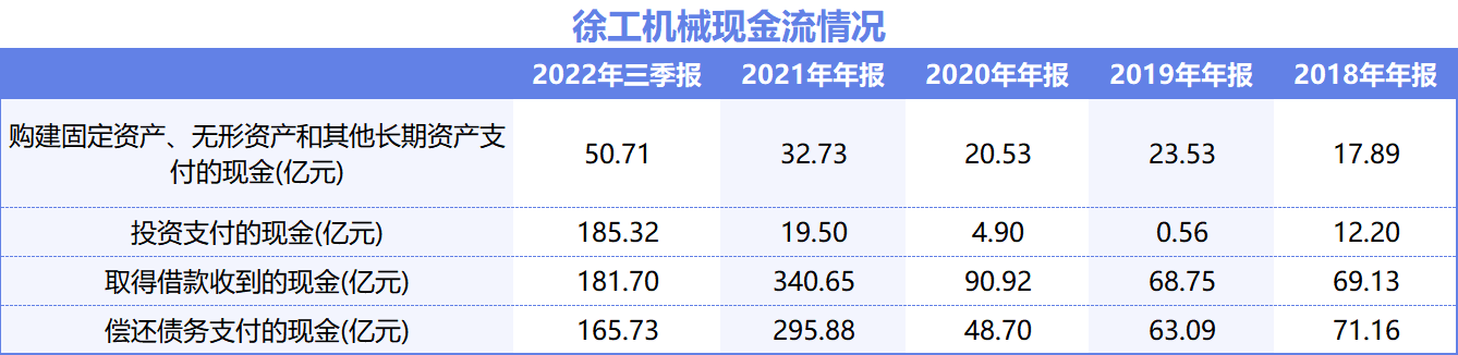 从财务数据上看,公司业务仍在大幅扩张。投资支付的现金2021年不足20亿元,2022年三季末用于投资的规模就飙至185.32亿元,9个月涨幅超8倍。