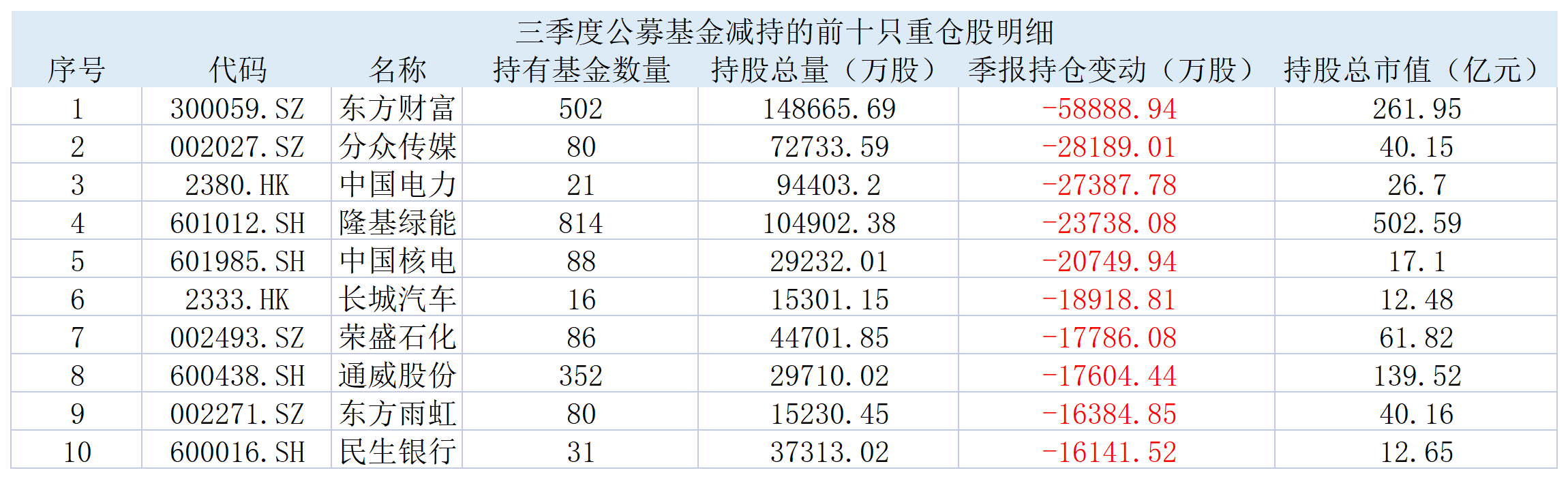 截至三季度末,也有多只龙头个股遭减持,例如“互联网券茅”东方财富(300059.SZ)、分众传媒(002027.SZ)、隆基绿能(601012.SH)、中国核电(601985.SH)等。