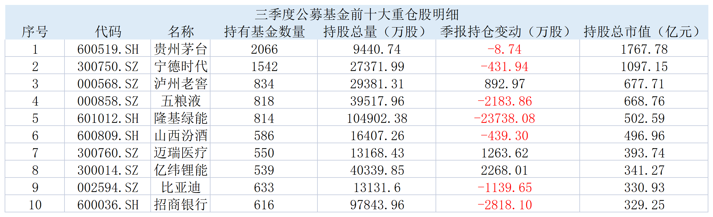 泸州老窖被834只基金重仓,成为三季度末基金重仓股第三名。与此同时,五粮液(000858.SZ)、隆基绿能(601012.SH)、山西汾酒(600809.SH)、迈瑞医疗(300760.SZ)、亿纬锂能(300014.SZ)、比亚迪(002594.SZ),招商银行(600036.SH)分别位列三季度末基金重仓股前十名。 相比于二季度末,公募基金在五粮液、隆基绿能等多只个股上的持仓数量也明显减少,仅泸州老窖、迈瑞医疗和亿纬锂能的持仓数有所增加。