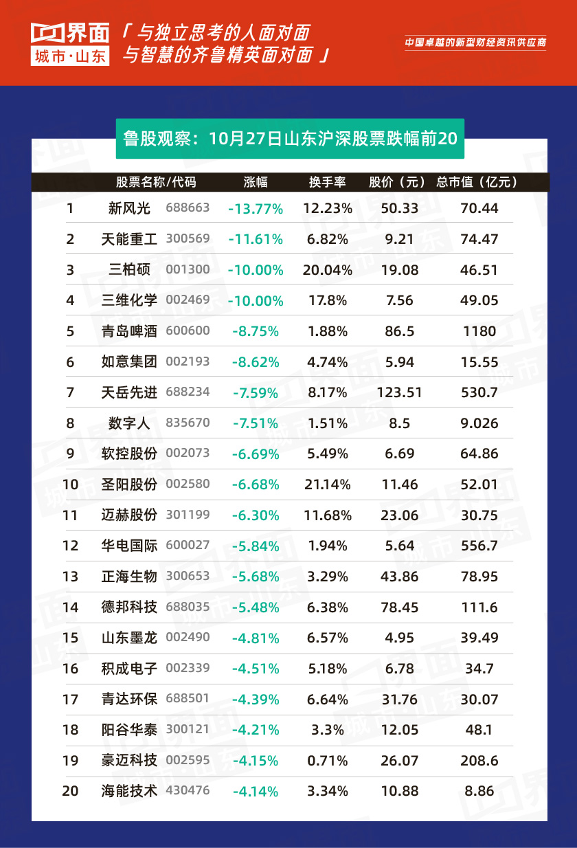 青岛市跌幅榜首:天能重工(300569),涨幅-11.61%,股价9.21元,总市值74.47亿元;