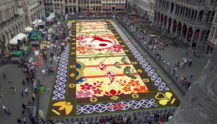 在今年八月初短短几天时间内,比利时中心的布鲁塞尔大广场上,一幅由鲜花组成的巨大彩色地毯甚至衬托得广场上的鹅卵石都熠熠生辉。75米长,24米宽,这张巨型鲜花“地毯”总面积足有1800平方米,主要由秋海棠组成,中间夹杂着大丽花、青草以及楤木花,等等,每一平方米大约摆放有300盆花草。这些色彩鲜艳而亮丽的花朵拼出了一幅巨型的日本风格织锦“地毯”,远远看去,优雅多彩,活力勃发。