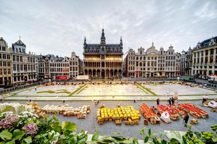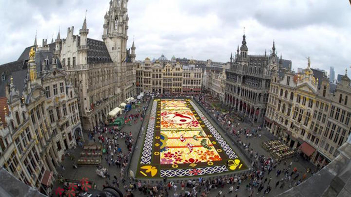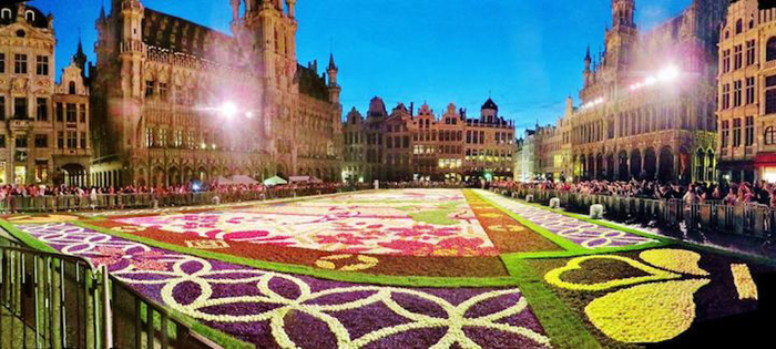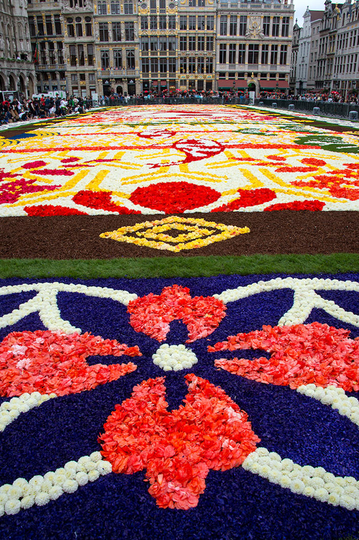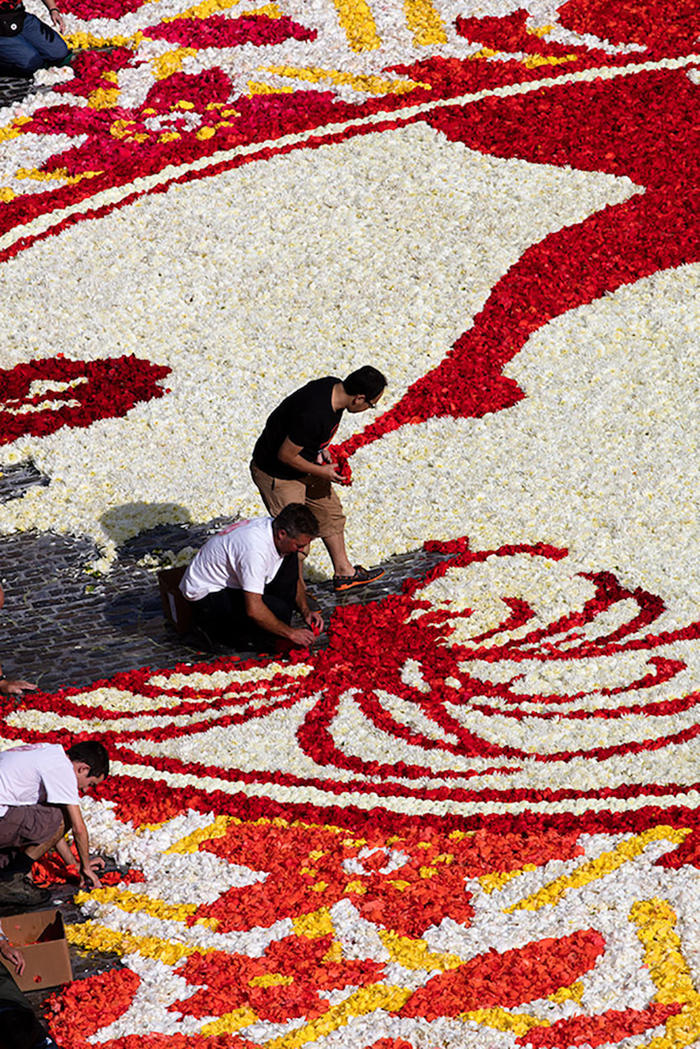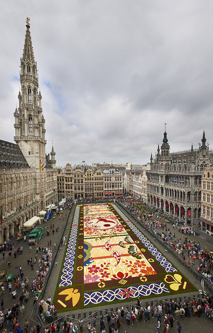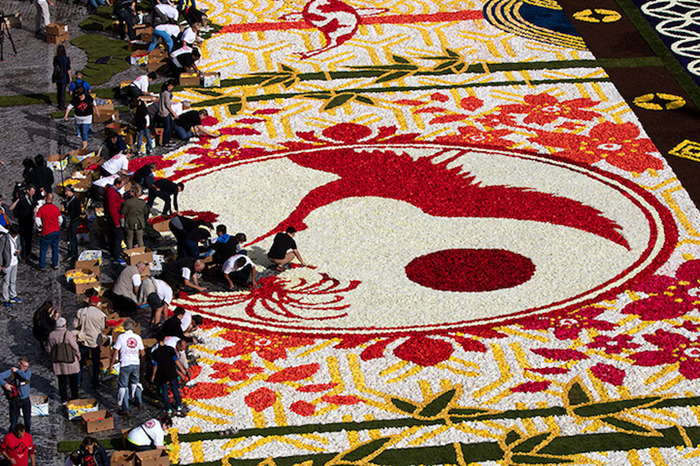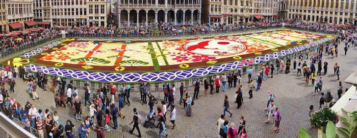 布鲁塞尔的鲜花地毯活动每两年会举行一次,从1971年开始,1986年迁至大广场举办,迄今已经是第20次了。每隔一年的8月15号,比利时非营利组织“鲜花地毯”(Tapis de Fleur)就会召集一群艺术家,包括插画家、平面设计师和景观建筑师等,根据当年的主题来设计并建造这个巨型花阵。这个团队会计算出配色方案以及其对花盆数量的需求,然后从很早之前就会开始储备花茎。在正式开始摆盆之前几天,团队会在广场上用塑料板摆出设计图,在接近完工的最后几个小时内,在一百来名志愿者的帮助下,60万盆各色鲜花会陆续归位,鲜花地毯就此完工。