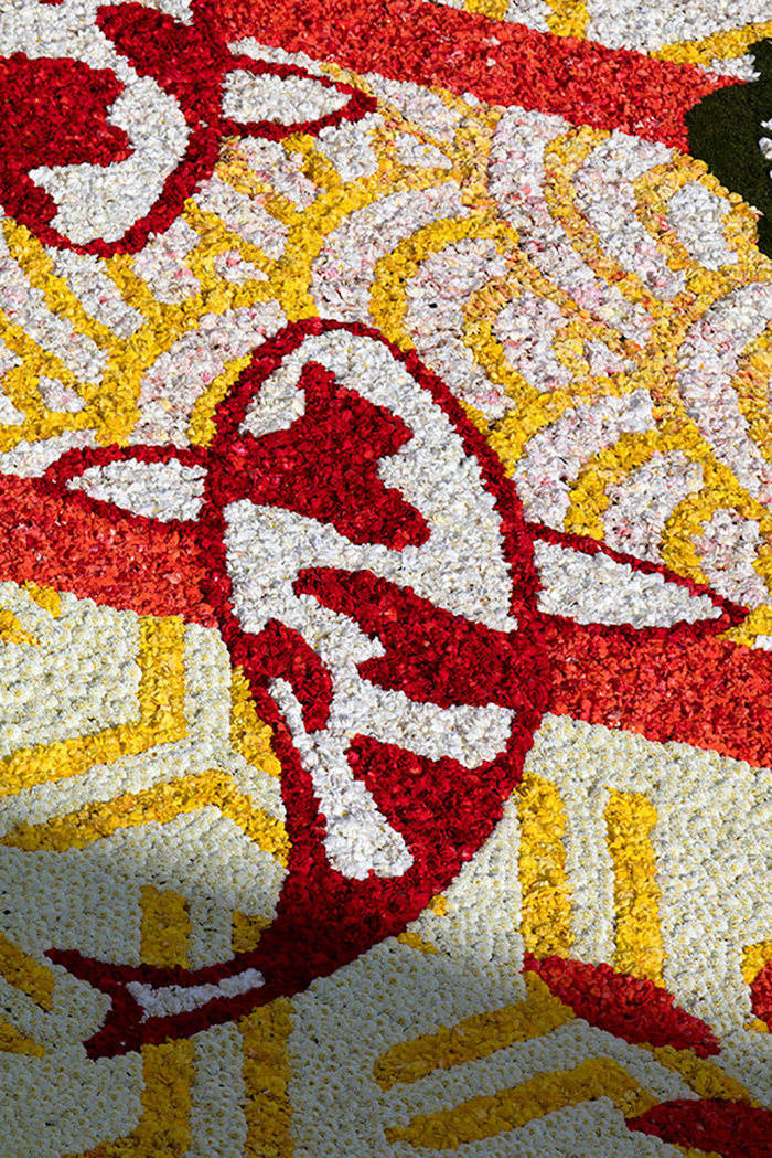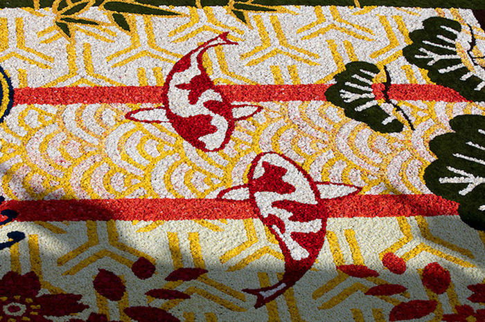 今年的鲜花地毯主题是为了庆祝比利时与日本和平交往150年,纪念1866年八月两国签署的《友好通商航海条约》。为了体现日本主题,清风、明月、飞鸟,象征着自然之美的花朵,象征着力量与成长的锦鲤,象征着积极向上的竹子和松树,以及代表日本传统文化的樱花等等多种元素都被包含在了图案设计中。
