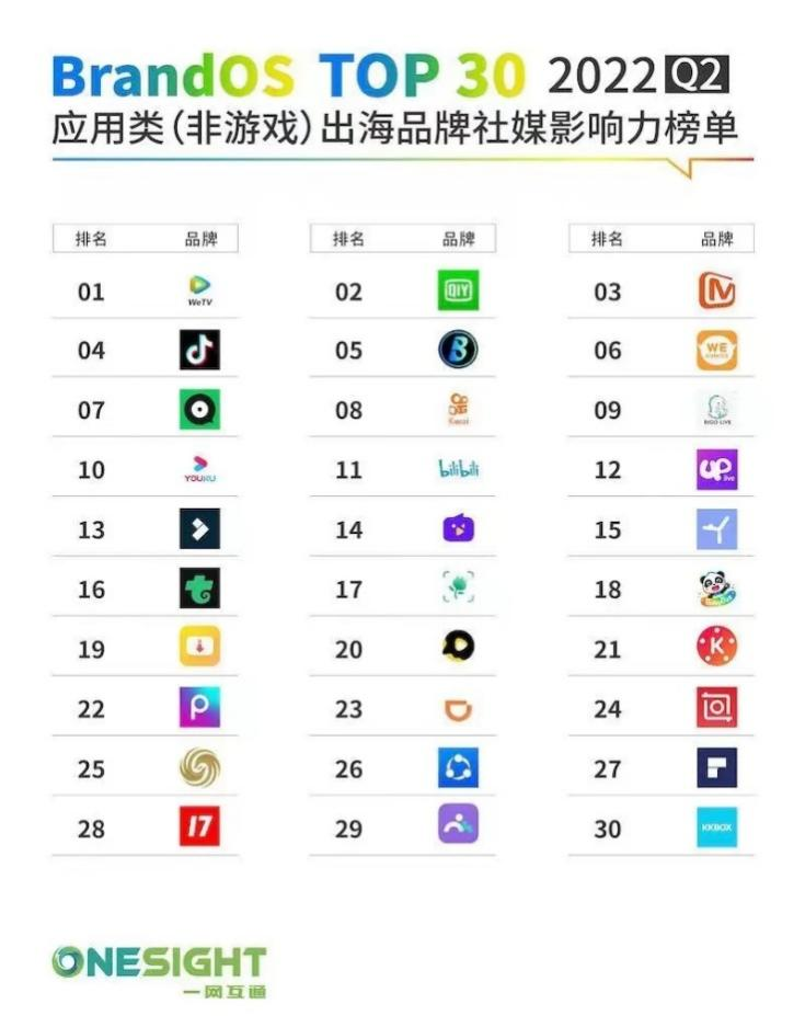 今年8月发布的《BrandOS TOP 100出海品牌社媒影响力榜单》上,腾讯视频WeTV、爱奇艺国际版iQIYI与芒果国际版MangoTV分列2022 Q2应用类(非游戏)榜前三位。在总榜上,WeTV更是取代了蝉联三期第一的游戏“原神”,跃至榜首。