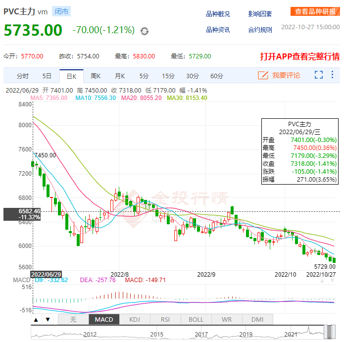10月27日盘中,PVC现货价格最低探至5729元/吨,截至收盘报价5735元/吨,较月初价格再跌7.26%,较今年4月初走出的年内价格高点9529元/吨下跌近四成。