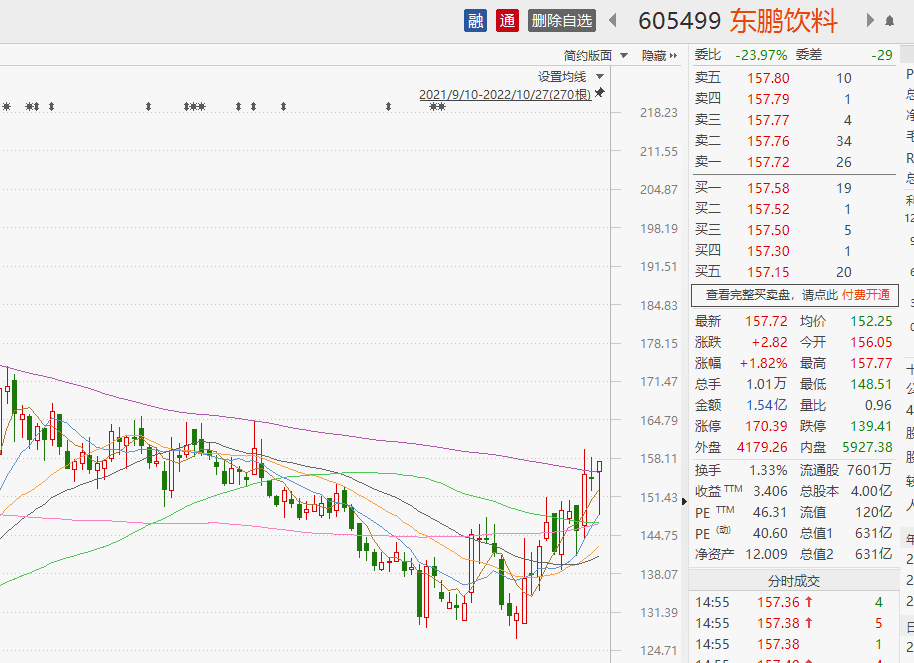 从二级市场表现来看,东鹏饮料2021年5月上市后节节攀升,并最高触及280.44元/股的高点,市值突破1100亿元。随后公司股价下行后维持震荡,最新股价为157.72元/股。