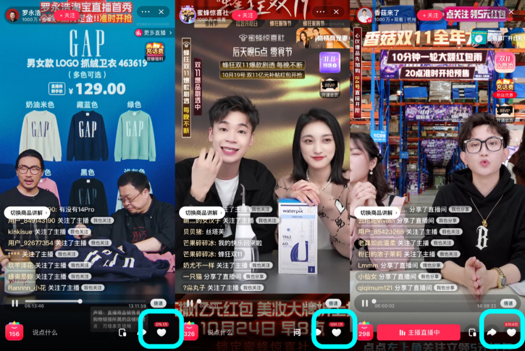 另外,首场直播,他的点赞数只有375万,而蜜蜂惊喜社是1291万,香菇来了也有670.5万。
