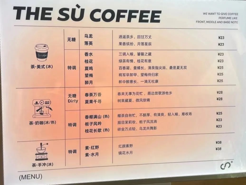 还有许多茶咖专门店,在西安,素咖啡·茶咖的菜单分为茶·美式、茶·奶咖、茶·手冲三大类,价格多在23~28元,均价25元。
