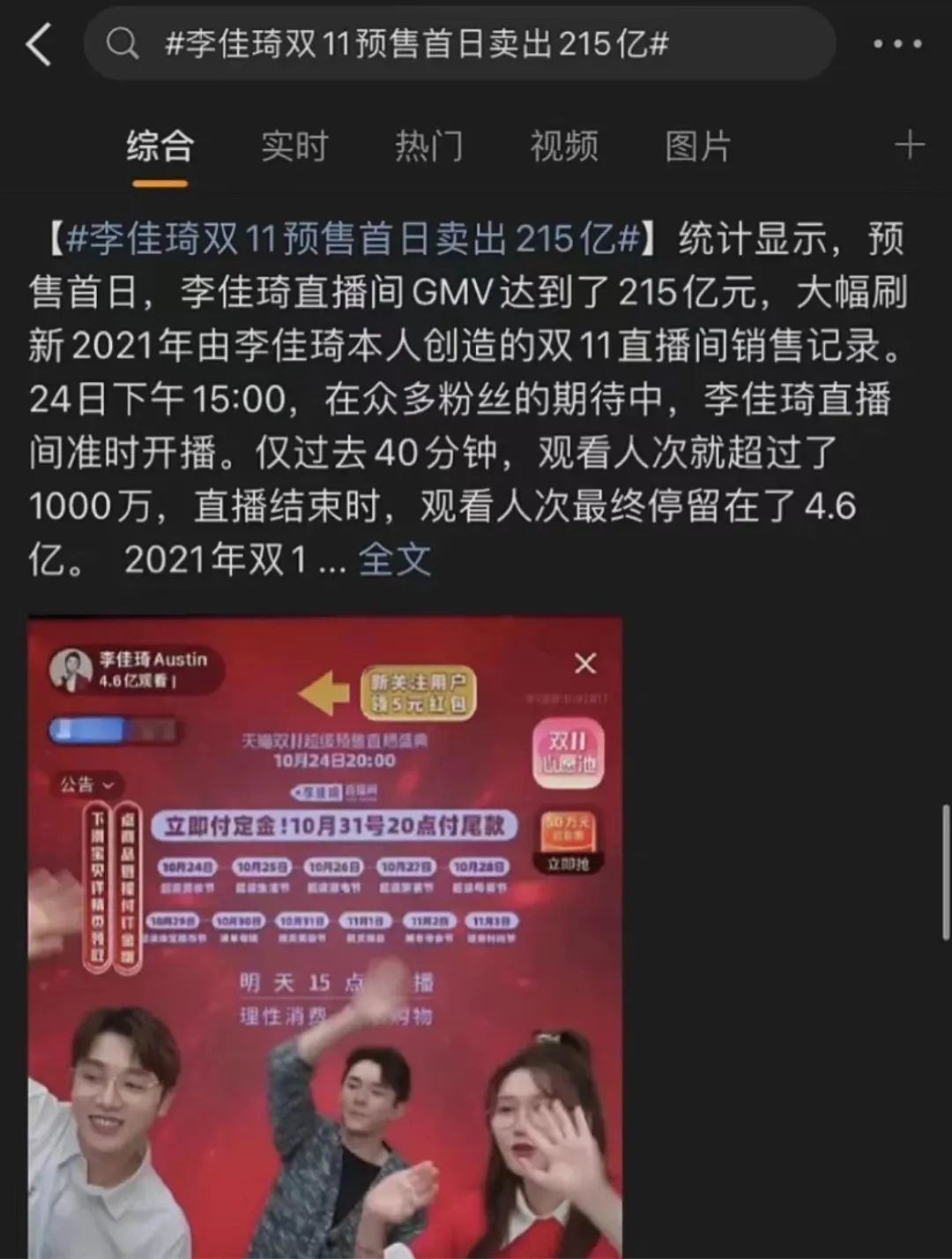 淘宝直播的第一把交椅仍然属于李佳琦,这一天,“所有女生”们会记得他从下午15点出现在直播间,直到当晚23点55分,中间只有不到半小时的离场,换来的是场观4.6亿、2.54亿赞,以及据称大幅刷新去年销售记录的预售首日GMV 215亿元。