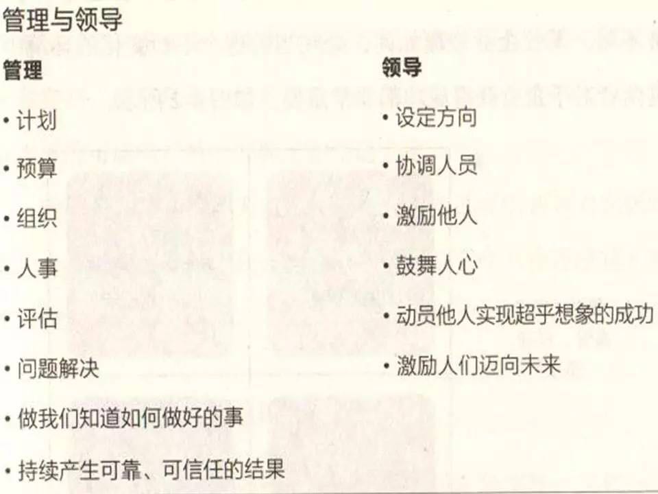 传统的管理重点在于计划、预算、组织、人事、评估,问题的解决,做我们知道如何做的好的事情,持续地产生可靠、可以信任的结果,领导是设定方向,协调人员,激励他人,鼓舞人心,动员他人实现超乎想象的成功,激励人们迈向更加美好的未来,推动变革。