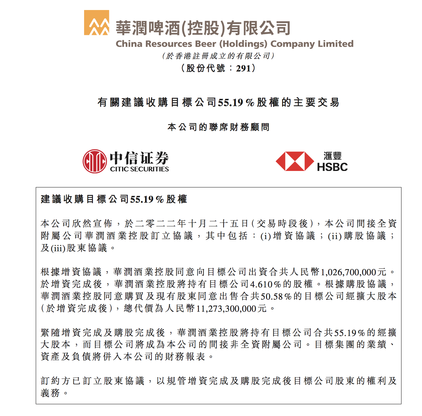 华润啤酒(HK.00291)10月25日公告称,其间接全资附属公司华润酒业控股有限公司(以下简称“华润酒业”)已与相关方签订协议,拟通过增资扩股和股权购买的方式,获得贵州金沙窖酒酒业有限公司(以下简称“金沙酒业”)55.19%的股权,增资加购股总金额约123亿元。交易完成后,华润啤酒将成为金沙酒业第一大股东。