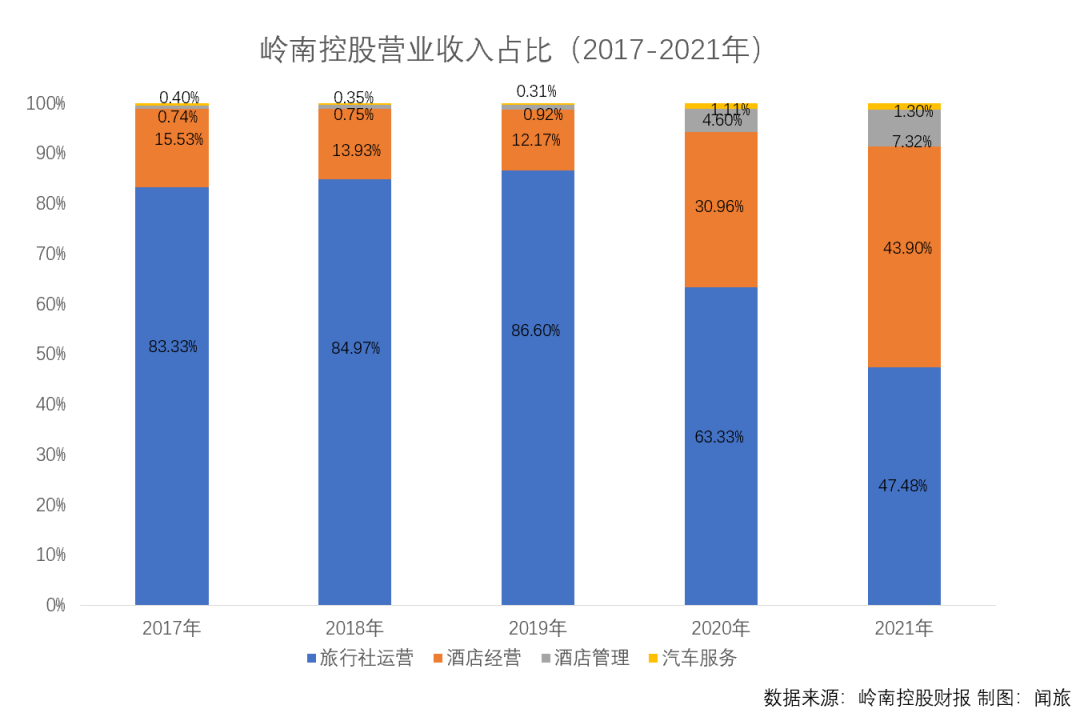从公告中可以看出,岭南控股正在加速酒店布局扩张。闻旅注意到,2020年以来,岭南控股酒店经营业务贡献的收入逐年攀升,占据公司营业收入的“大头”。一系列的动作下,是否意味着岭南控股正在寻找新的业务增长点,加大酒店业务的布局是优解还是挑战?