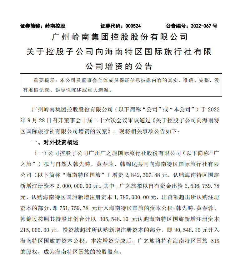 除扩大酒店业务布局之外,岭南控股近期也有新动作。9月28日,岭南控股公告披露旗下广之旅增资收购海南特区国际旅行社有限公司(以下简称“海南特区国旅”)51%股权,加强对海南旅游资源掌控力,布局国际旅游岛+自由贸易港。海南是国内唯一具备自由贸易试验区、保税区、国际旅游岛、国际旅游消费中心、海南自由贸易港等多项战略定位的区域,也是免税业务及其活跃的市场所在,收购海南特区国旅这一动作,给岭南控股延伸旅游业务提供了更大的想象空间。