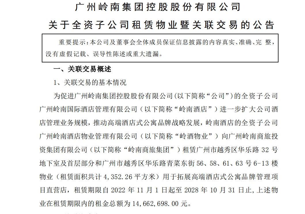 近日,广州岭南集团控股股份有限公司(以下简称“岭南控股”)发布公告,称为拓展全资子公司广州岭南酒店管理有限公司(以下简称“岭南酒店”)酒店管理业务规模,拓展高端酒店式公寓品牌管理项目直营店,岭南酒店的全资子公司广州岭南酒店物业管理有限公司(“岭南物业”)租赁广州多处物业。