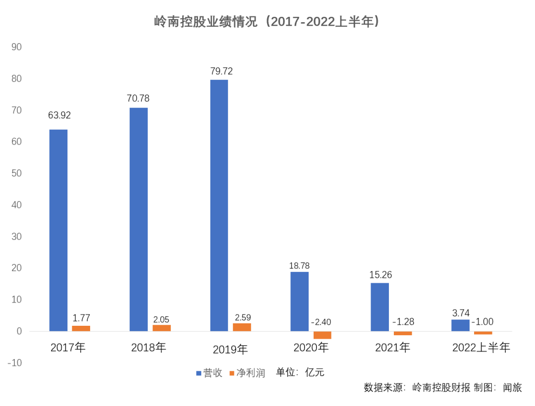 2021年,出入境旅游组团业务尚未恢复运营,且受国内疫情点状出现及跨省游随机熔断的影响,其业绩依然是亏损状态。2021年岭南控股实现营收15.26亿元,同比去年下降18.71%,净利润亏损1.28亿元。2022年上半年净利润亏损1.00亿元,亏损金额快赶超2021年整年净利润亏损。