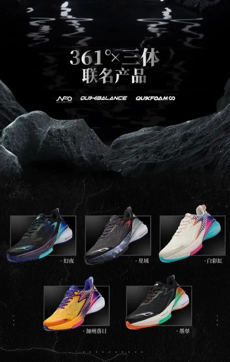 2020年12月,361°与《三体》联名发布新款运动鞋。当国产运动鞋品牌纷纷跨入“科技材料”这条赛道时,考验的就是营销包装方式。361°选择新系统、新品首发与《三体》合作,原因亦在于此。
