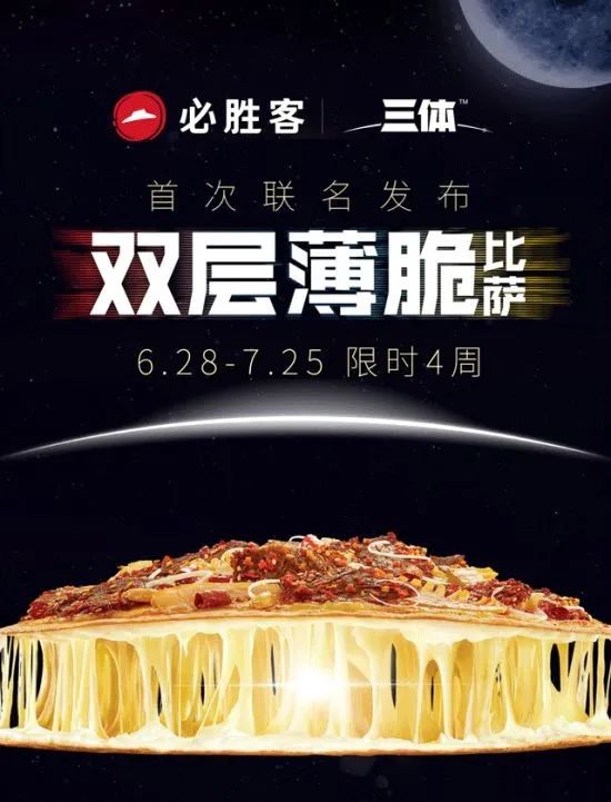 必胜客旗下的双层薄脆披萨连续3年的营销路线都是“科技范儿”,“用科技的方式去诠释比萨的薄脆”。第4年,必胜客终于遇到了《三体》。尽管联名产品和《三体》真的没有太大关系,但冲着印刷了大量经典台词的宣传图,你能说它们之间真没一点关系?