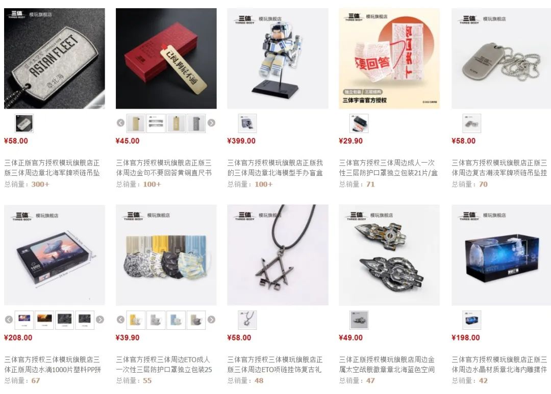 实际上,在IP的衍生开发和授权联名的过程中,具象化的符号是最有利于建立商品和粉丝之间的直接联系,而具象化的符号需要通过影视化内容构建。打开天猫《三体》模玩旗舰店,商品销量最高的分别是章北海的军牌吊坠、刻有台词的直尺和章北海手办,纵观整个旗舰店,大量商品都出自同人动画《我的三体》。作为被游族收购的同人动画,《我的三体》影响力一直维持在核心粉丝层面,这也造成了衍生周边的销量相较于小说完全不值一提,但是从这些商品却可以凸显出小说被具象化后在衍生开发、联名合作方面所具备的明显优势。