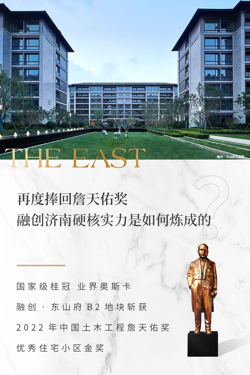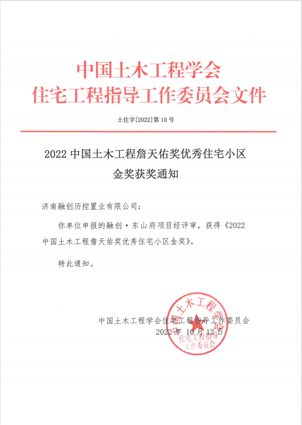 近日,由中国土木工程学会评选的詹天佑奖结果公布,融创·东山府从全国数百个房地产项目中脱颖而出,荣获 “2022中国土木工程詹天佑奖优秀住宅小区金奖”,体现了业界权威对融创产品的高度认可。