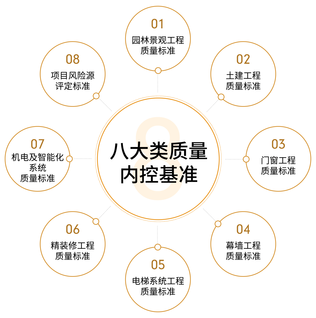 在多年产品营造能力与经验基础上,融创制定明确的项目工程施工体系,以领先行业标准的《质量内控体系》为标尺,以“八大类质量内控”为基准,1500多个等于或高于国家标准的子项,243项评估分项、22道关键工序样板验收、27项施工停止点检查贯穿项目全周期,在通往产品品质的道路上没有捷径,以最苛刻的标准,方能满足最挑剔的目光,全面建立起城市建筑的品质标杆。