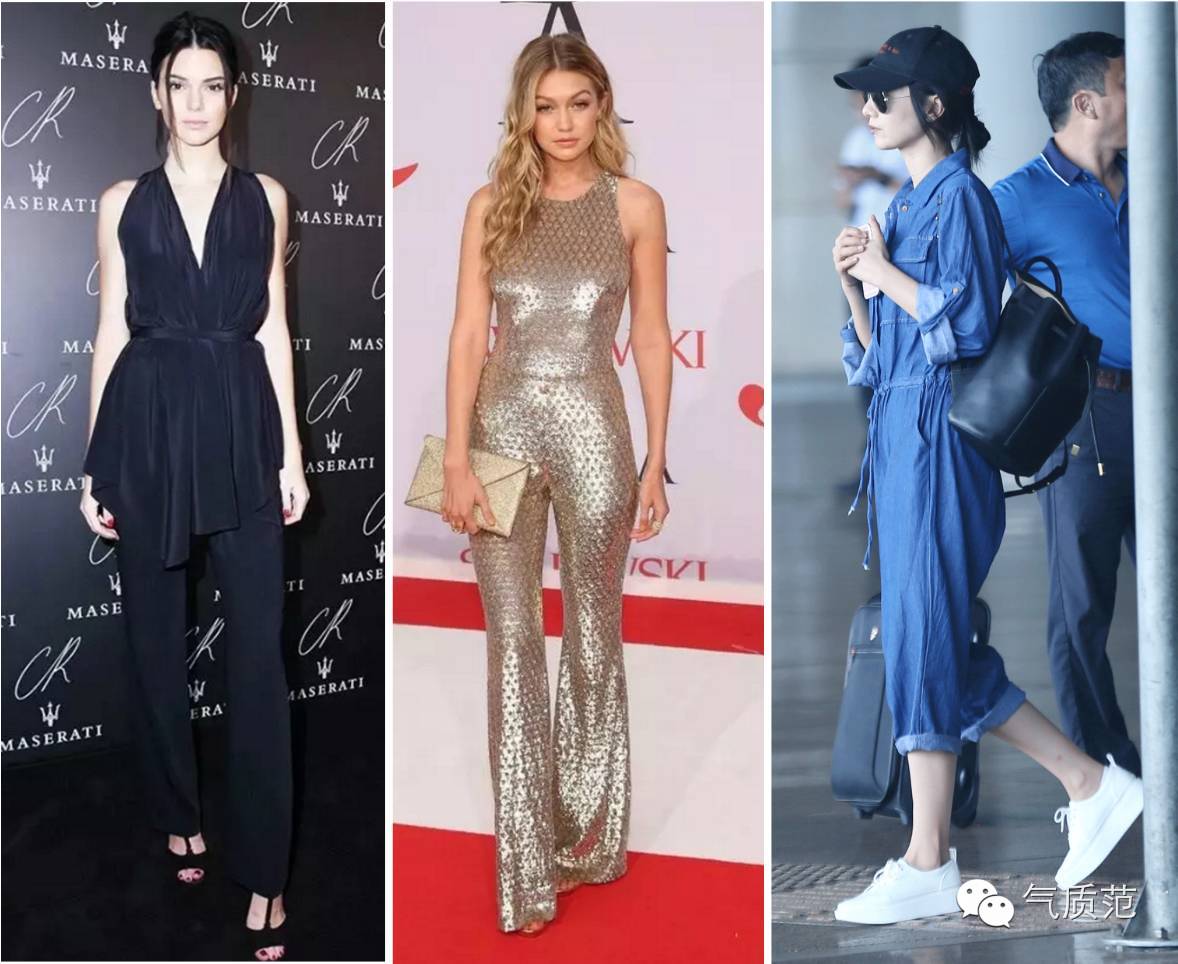 除了白色,还有不同颜色和材质的连体裤,以及紧身和宽松的款式,即使是不方便,连体裤也成为了时髦人士人手必备的一款单品。肯豆、Gigi、高圆圆分别演绎了连体裤的三种不同风格。