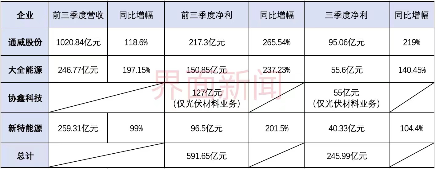 截至目前,除协鑫科技(03800.HK)外,其他三家公司的三季报均已全部出炉,前三季度净利增幅均超2倍。