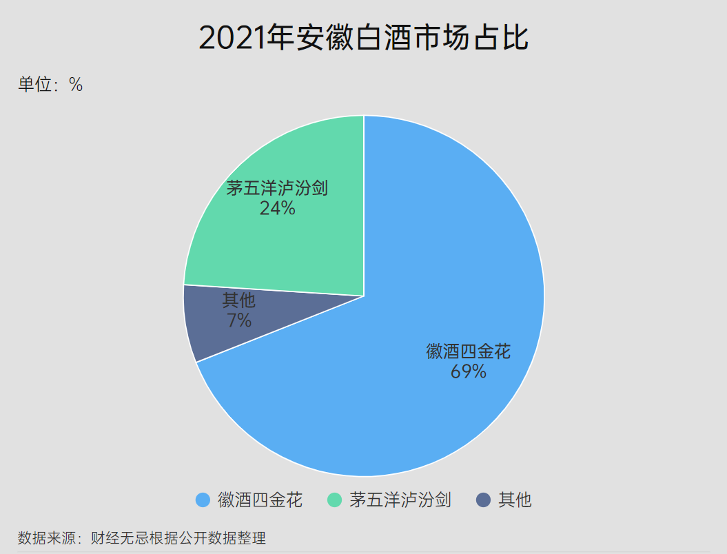 随着安徽省消费升级的不断推进,根据行业数据统计,2021年安徽白酒市场大约69%的份额被徽酒四金花占据,以茅五洋泸汾剑为代表的省外名酒占据了24%左右的份额。