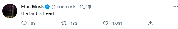 继将身份认证更改为Chief Twit(推特老板)后,马斯克发布最新推文称:the bird is freed(鸟儿自由了),推特的LOGO就是一只小蓝鸟,意即“推特自由了”。