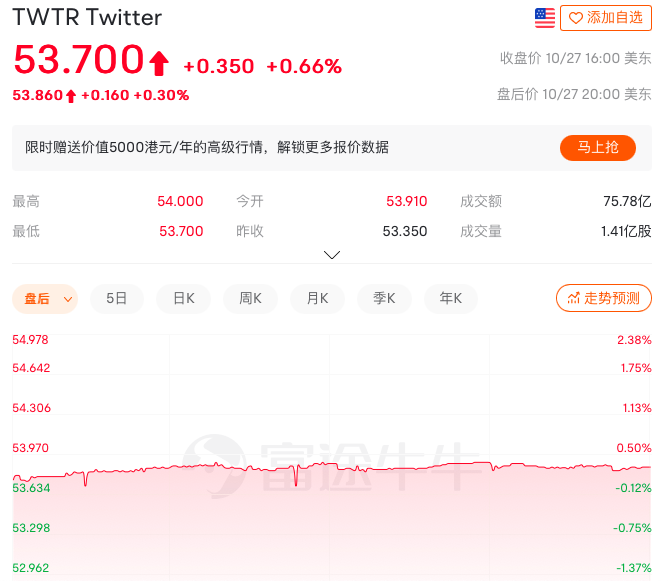 受收购交易落地的消息刺激,推特股价应声上涨。美东时间10月27日收盘价为53.7美元/股,涨幅为0.66%,市值410.94亿美元;盘后,推特股价继续上涨0.3%达到53.86美元/股,接近于马斯克最初的收购报价(54.20美元)。