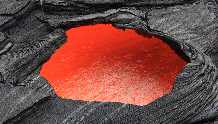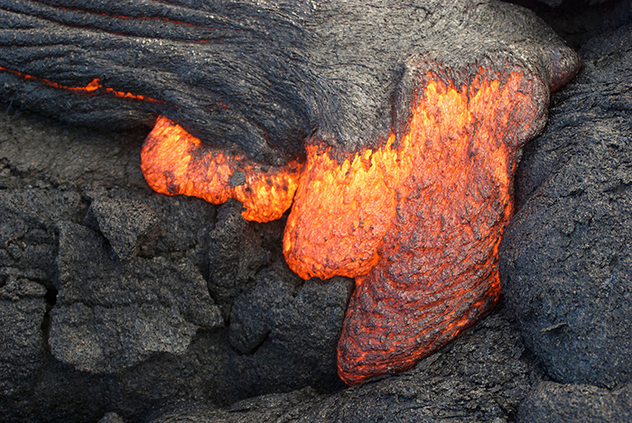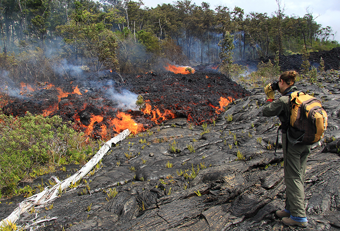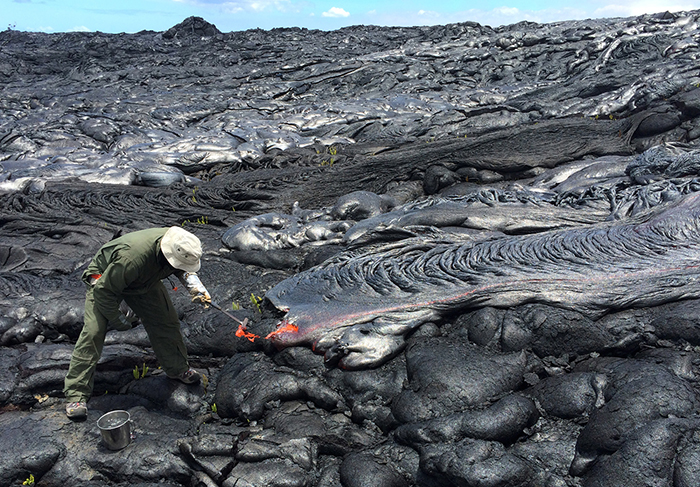 4.2016年6月23日,一名观测站的地理学家正在采集新鲜岩浆样本,以便进行化学分析。这些样本大多来自流出的绳状熔岩(pāhoehoe)分散的边缘。