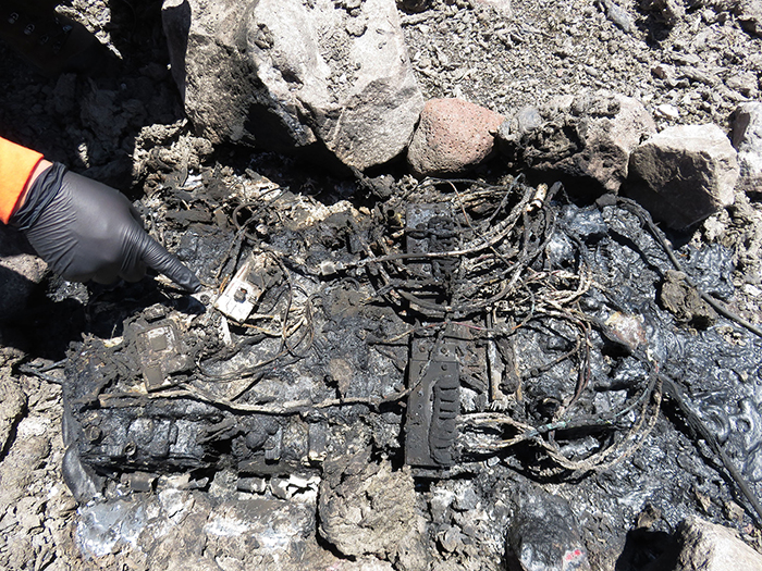 13.将火山监测设备安装在哈雷茂茂火山口的边缘,是整个探索行动中最容易发生损失的行动。图中这堆被融化的塑料包裹着的烧焦的电线和金属部件,是重力仪供电设备仅存的残骸,它们之前被安置在离火山口24米远的地方。