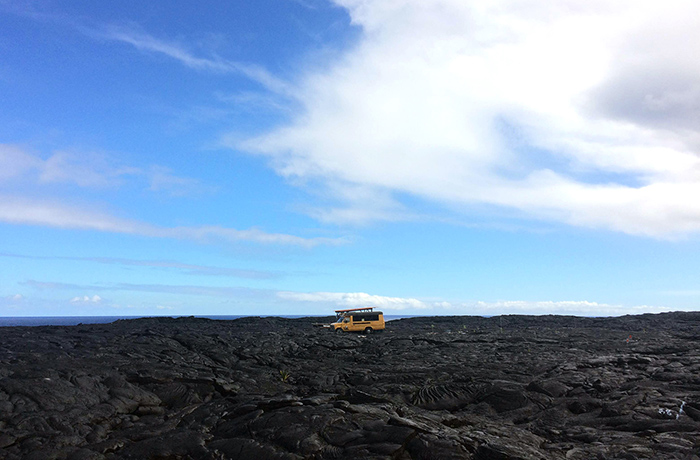15.2016年8月8日,一辆被用作据点的校车,伫立在一片熔岩地上,守护私人财产。这里位于夏威夷卡拉帕纳国家火山公园(Volcanoes National Park in Kalapana)附近。曾经因为火山熔岩失去家园的人们,开始在冷却的熔岩地上重建家园。眼下这次熔岩流动,自五月起从几英里外的一个火山裂口喷发出来,在七月的时候流入大海。游客们可以在熔岩周围10英里的道路上环游,也可以乘坐船只或直升机观看岩浆。