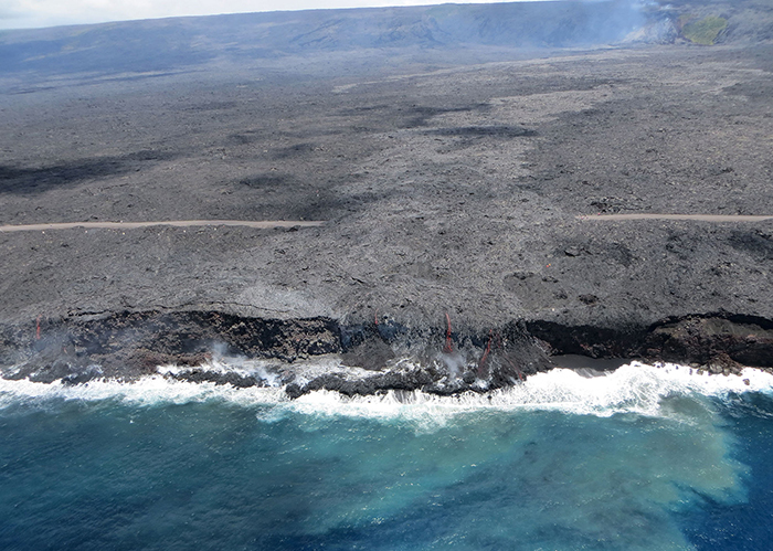 12.2016年7月29日,岩浆阻断了一条公路。入海点将岩浆填补到海崖底部的碎石上。由岩浆和海水相互作用而形成的黑沙,同海浪侵蚀着的岩壁一起,沿着海岸线不断堆积。