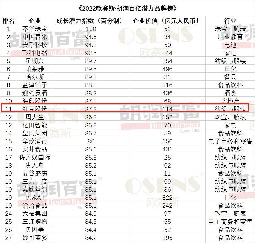 日前,胡润研究院发布《2022胡润百亿潜力品牌榜》,100家最具成长潜力的中国本土企业上榜。战略转型蜕变的红豆股份(600400.SH)首次上榜,位列“百亿潜力品牌榜”第11名及“价值增长领先企业”Top前10。据悉,榜单按照企业“成长潜力指数”排名,参考企业2022年的营收增速和市值增速两个维度给出综合评分。营收增速是企业2022年上半年的营收相对于去年同期的增速,市值增速是企业2022年7月29日的市值相对于去年同期的增速。