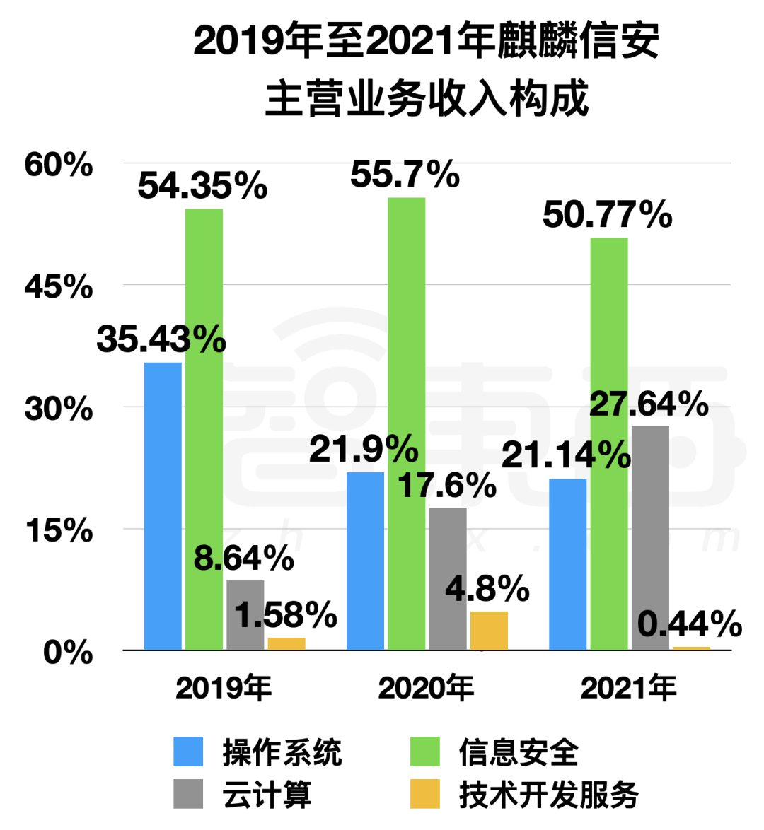 不过,从其主营业务构成来看,作为国产操作系统第一股的麒麟信安,信息安全相关的业务却成为了其第一增长曲线,2019年至2021年该业务营收占比达到54.35%、55.7%、50.77%。此外,其云计算业务三年间复合增长率也达到了178.47%,操作系统业务则相形见绌。