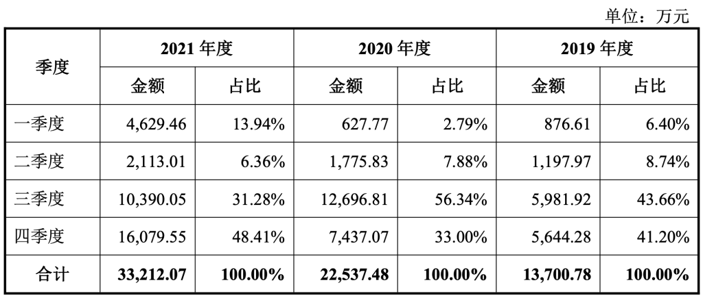 麒麟信安的营收因客户、产品特征所致,随季度变化影响较大。其中,2019年至2021年三、四季度的营收占比每年均超70%。