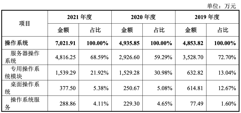 基于此,麒麟信安的操作系统业务也由服务器操作系统、专用操作系统、桌面操作系统和操作系统服务组成。其中服务器操作系统在其操作系统营收中占比较高,2019年至2021年分别为72.7%、59.29%和68.59%。