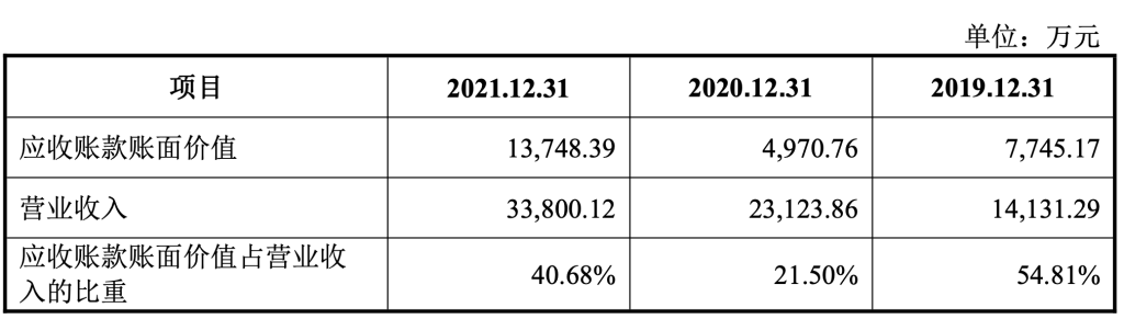 此外,招股书显示,麒麟信安的应收账款账面价值在其营业收入中所占比重较高,2021年的应收账款账面价值已经达到1.37亿元,占营收比例为40.68%。