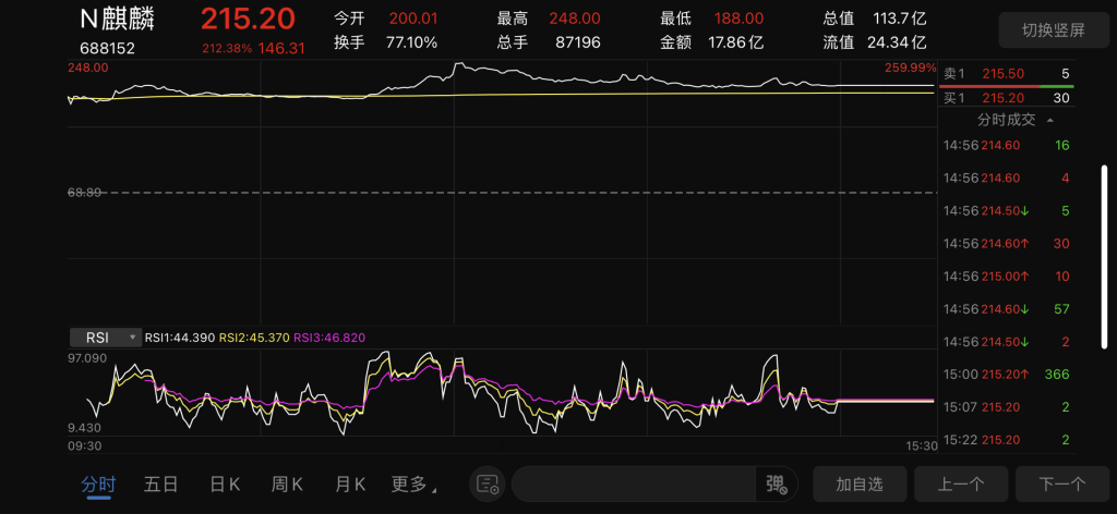 麒麟信安开盘价为200.01元/股,随后一路大涨,最高达248元/股。截至首日收盘,其股价为215.20元/股,涨幅达212.38%,总市值113.7亿元。