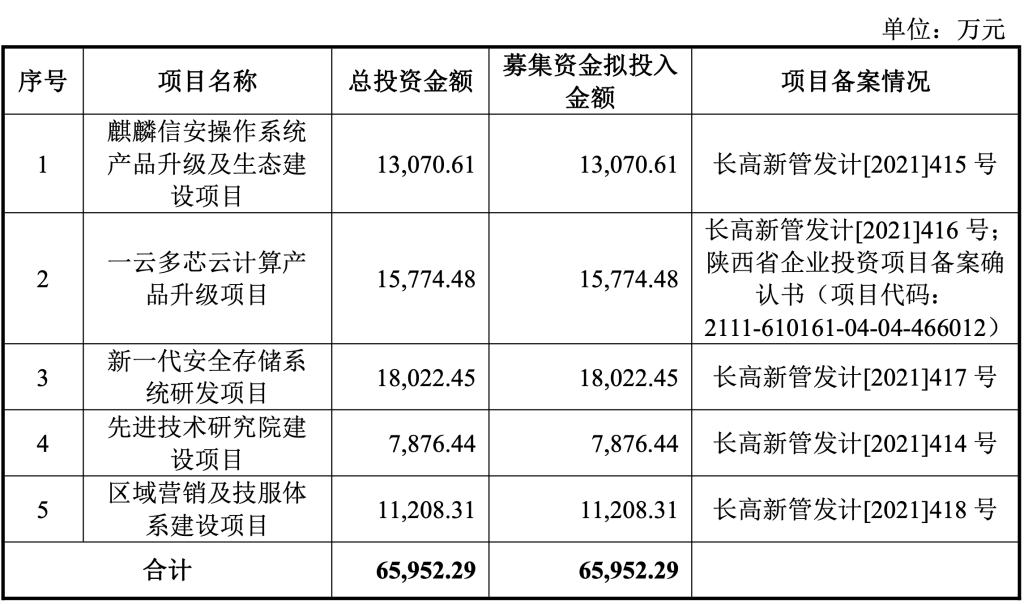 招股书显示,该公司此次募集资金总额为6.60亿元,主要用于麒麟信安操作系统产品升级及生态建设项目、一云多芯云计算产品升级项目、新一代安全存储系统研发项目、先进技术研究院建设项目、区域营销及技服体系建设项目,募集资金用途都围绕着该公司的主营业务展开。值得注意的是,这一募集资金总额已经将近该公司2021年总营收的2倍。