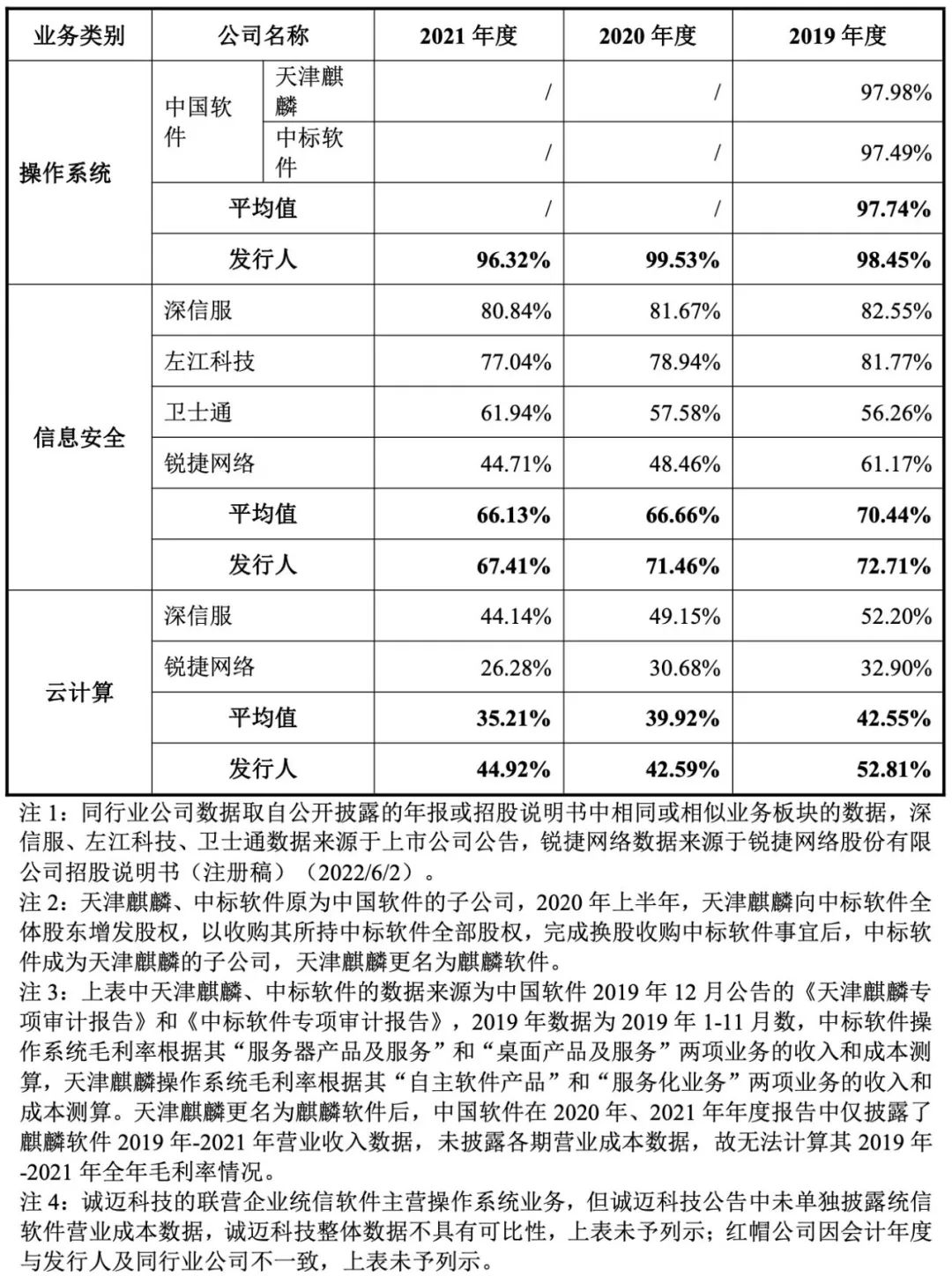 与同行业可比公司相比,在操作系统、信息安全、云计算不同领域中,麒麟信安的综合毛利率都接近于可比公司的平均值。