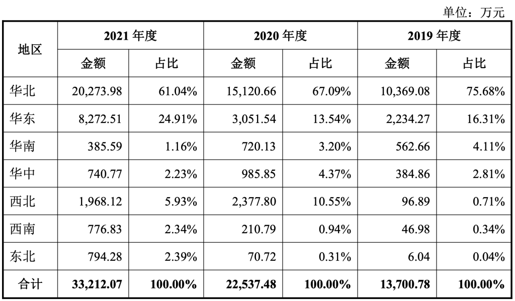 目前,麒麟信安的营收构成具有明显的地域特征,2019年至2021年,其在华北地区的营收均超过60%,这与该公司在华北、华东地区开展业务较早,且已经拥有较为完整的销售和技术支持团队有关,并且这些地区的经济发展水平较高,相对而言信息化建设投入也较多。